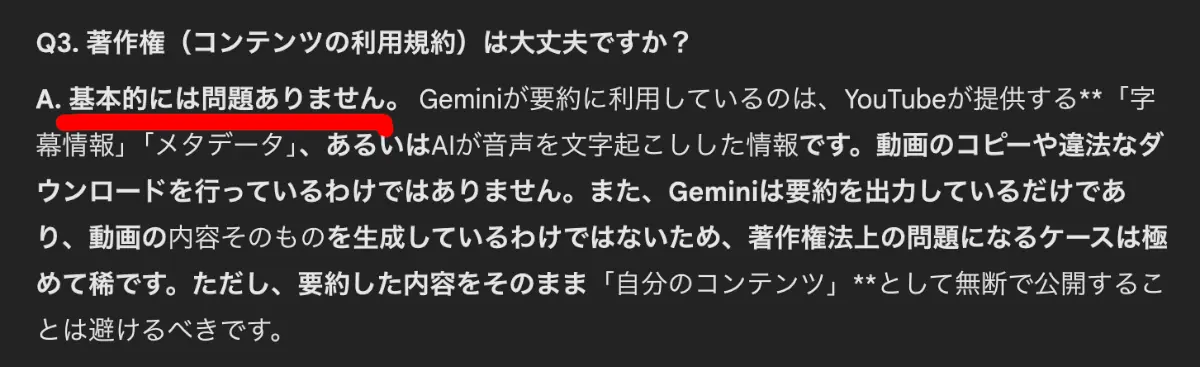 もっとも深刻だったのは、著作権に関するQ&Aのセクションでした。Geminiは自分の見立てとして「要約は引用の範囲内であり、著作権侵害の可能性は極めて低い」と、まるで法務の専門家のような口調で断定していました。