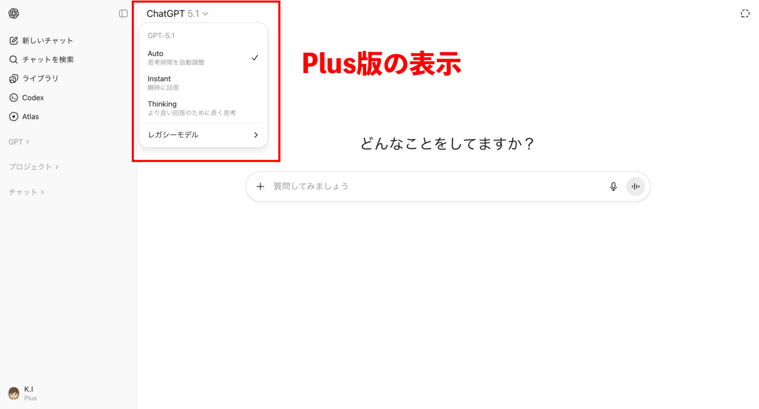 一方、Plus版では「GPT-5.1」とモデル名が表示され、Auto/Instant/Thinking を自分で切り替えられるようになっています。
