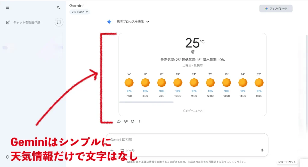 Geminiはシンプルに天気や気温を提示し、情報を端的にまとめています。余計なコメントはなく、調べものに近い感覚です。