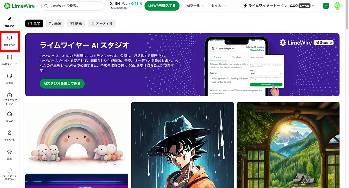 LimeWireは、AI技術を活用して画像や音楽、オーディオを生成するためのプラットフォームです。かつてはファイル共有サービスとして知られていましたが、現在ではAIの力を借りて、クリエイティブなコンテンツ制作の新たな地平を開いています。LimeWire AI Studioを使用することで、ユーザーは自分だけのオリジナル作品を簡単に作成し、それを公開することができます。さらに、公開した作品からの広告収入を得ることも可能です。