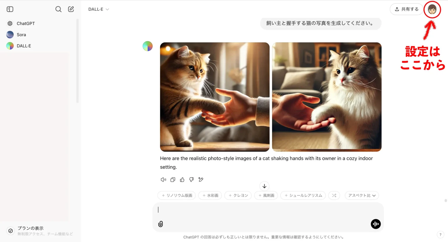 ChatGPTの画面右上に表示されているアカウントアイコン(プロフィール画像やイニシャル)をクリックします。この操作でメニューが展開されます。 - 「設定」を選択