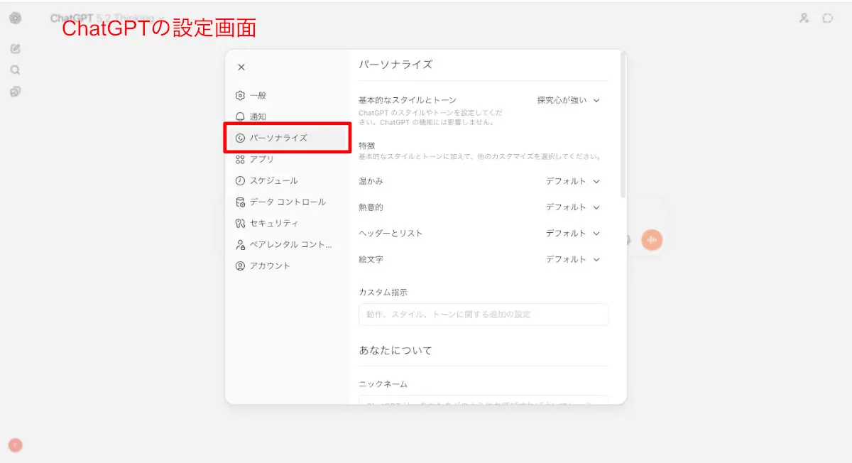 ChatGPTを自分好みに育てる(設定を整える)第一歩は、設定メニューの「パーソナライズ」を使いこなすことです。執筆時点(2026年1月)では、あなたの背景や好みのトーンを、より直感的に指定できるようになっています。